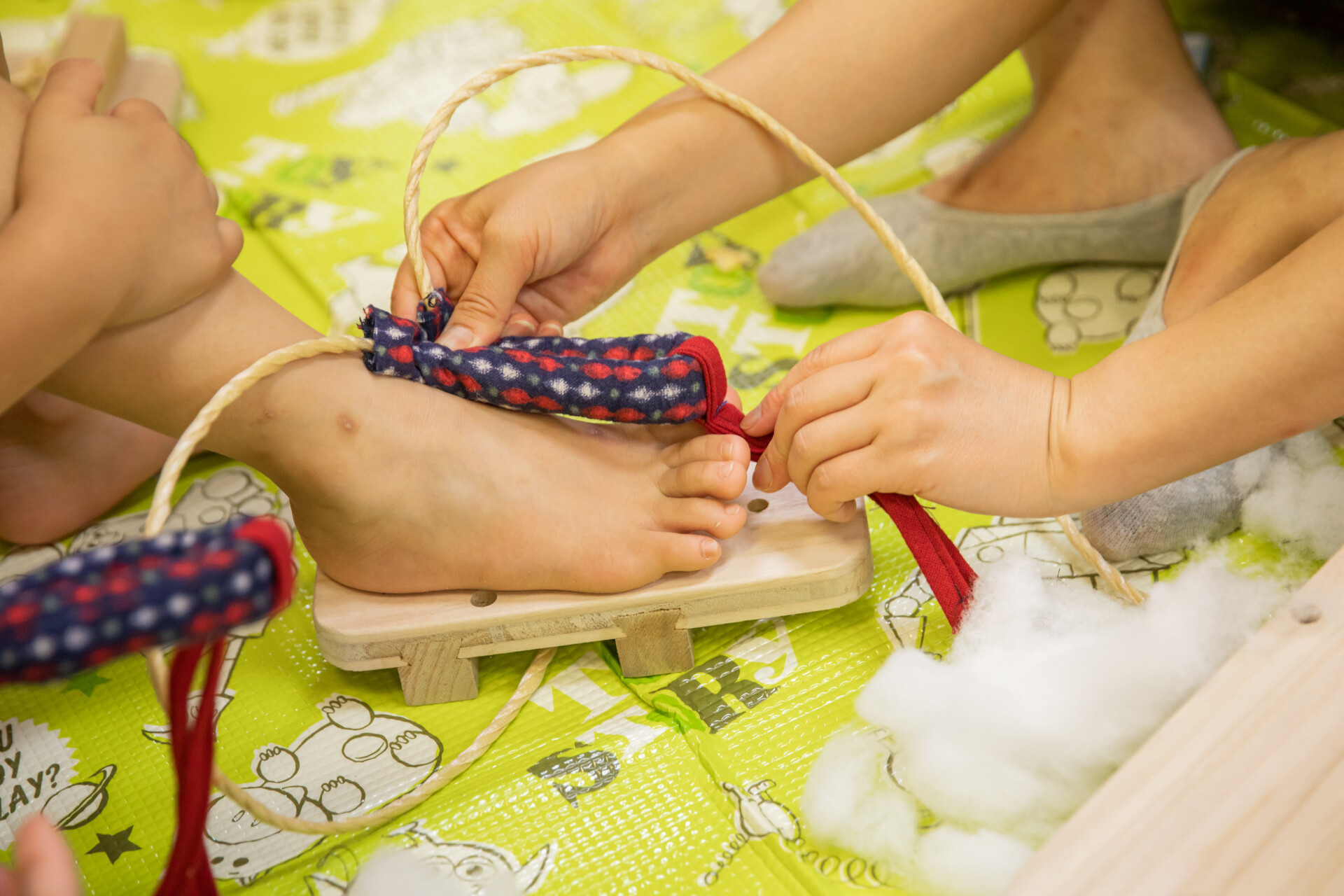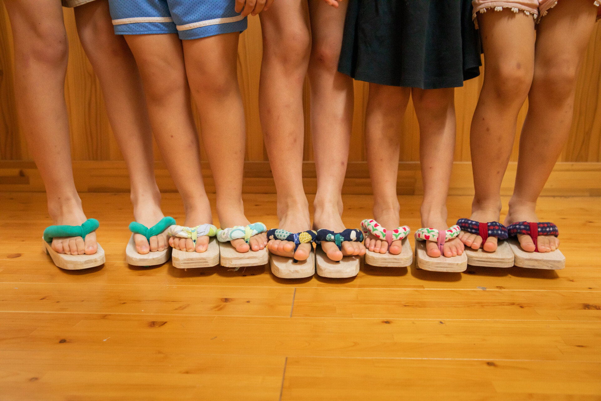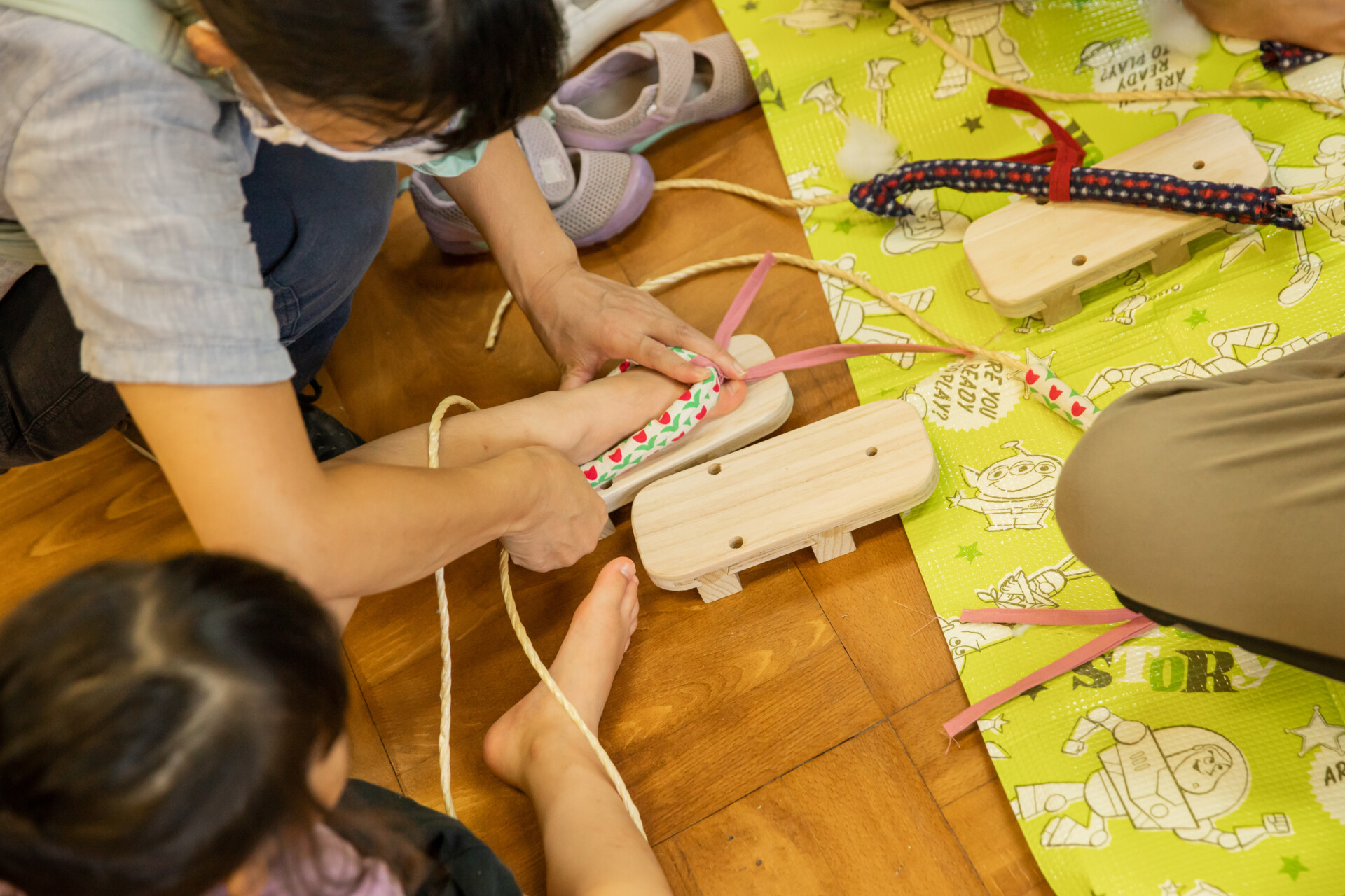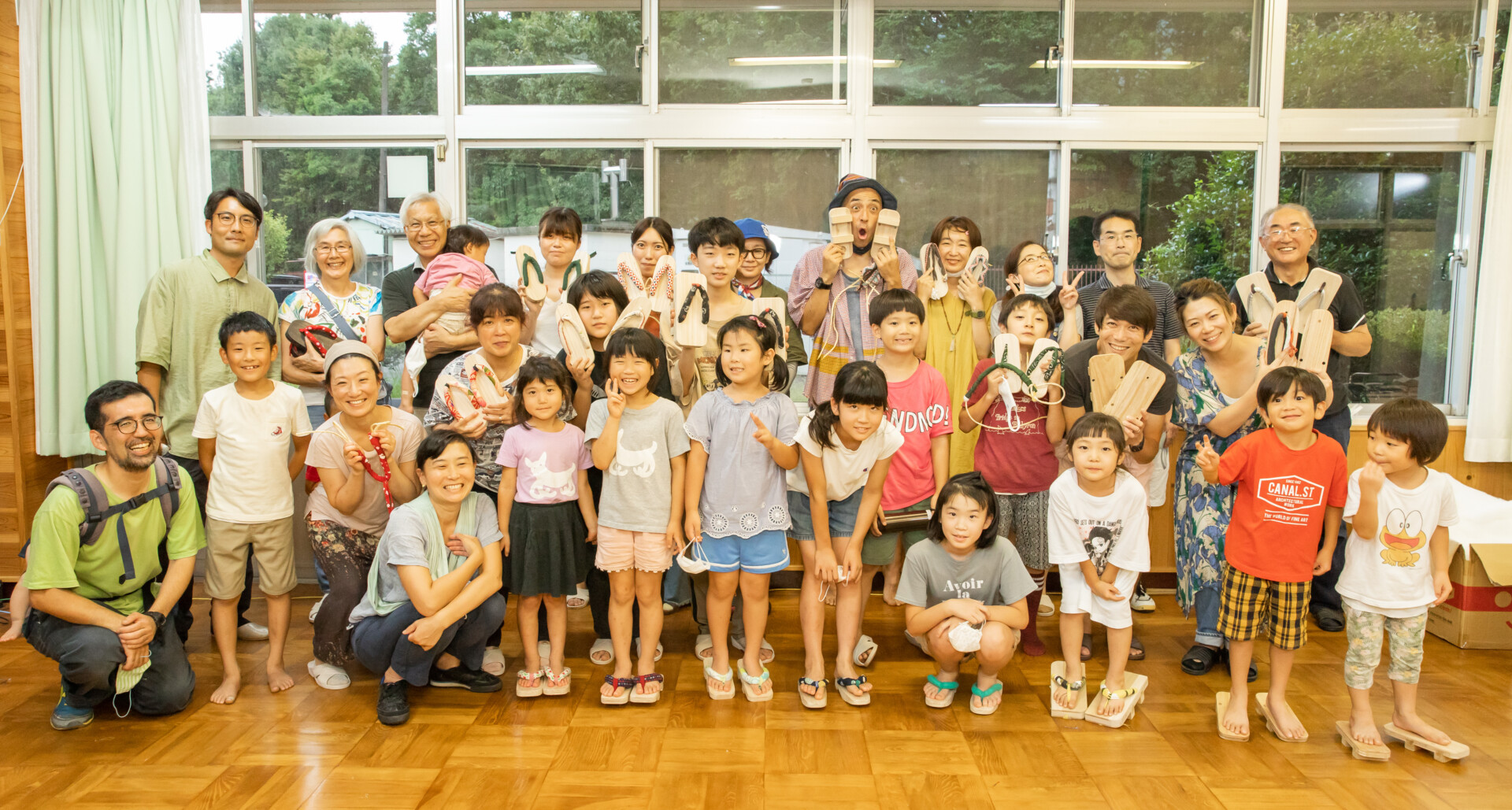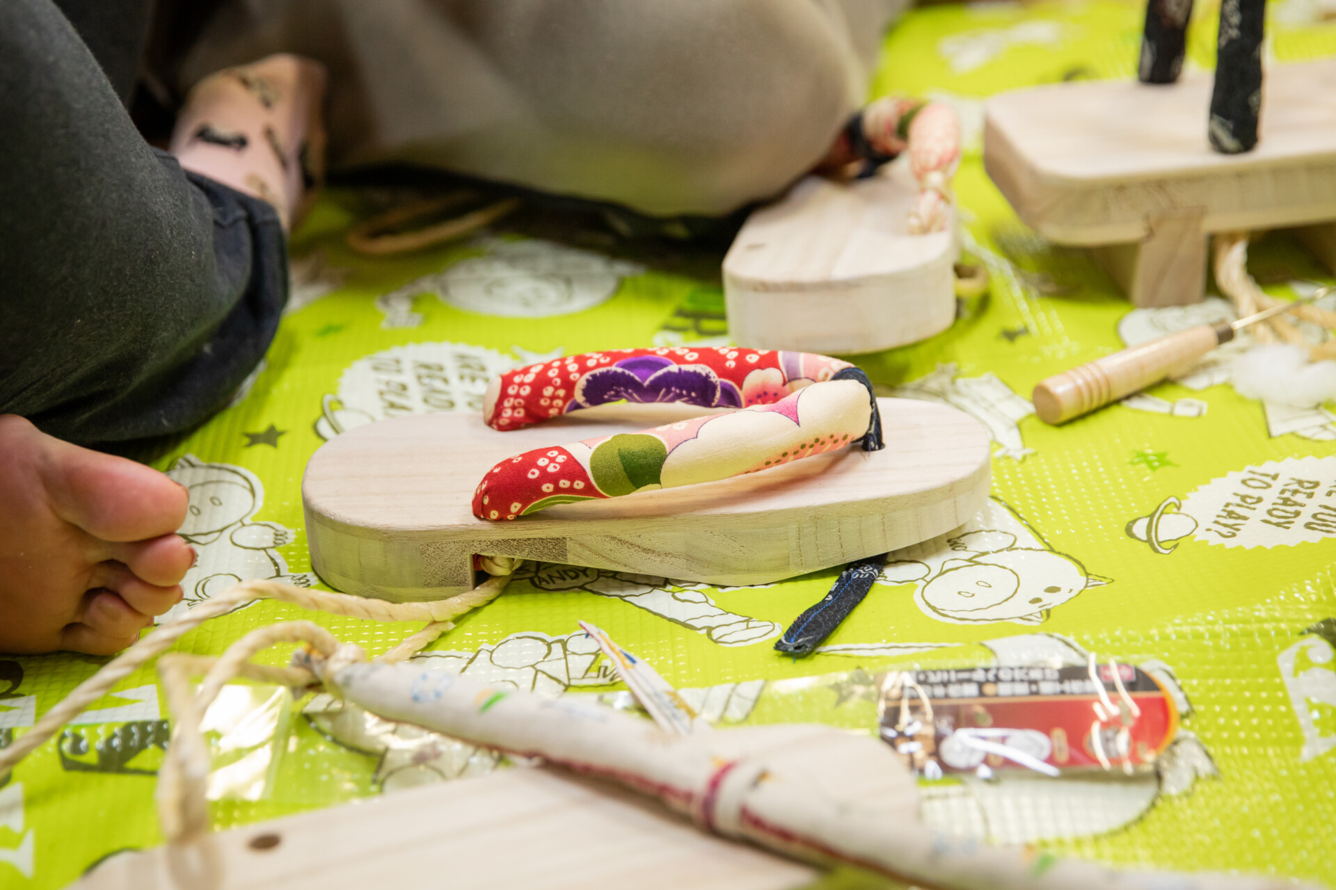 桐板から各自が加工して下駄を製作。それぞれが持ち寄ったハギレで鼻緒づくり。ミシンや道具を使いながら7時間かけて子どもも大人も自分の足に合ったオリジナルの桐下駄に。小さな子どもたちも自分の力で最後までやりきり、普段と違う歩く感覚を愉しみながら駆けまわっていた。今後は東京に自生する桐の木で東京ブランドの桐下駄ができたらと考えている。